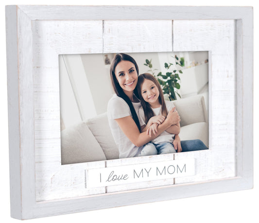 I Love My Mom Floral Matted Rustic White Wood Picture Frame with Metal Word Attachment Holds 4"x6" Photo