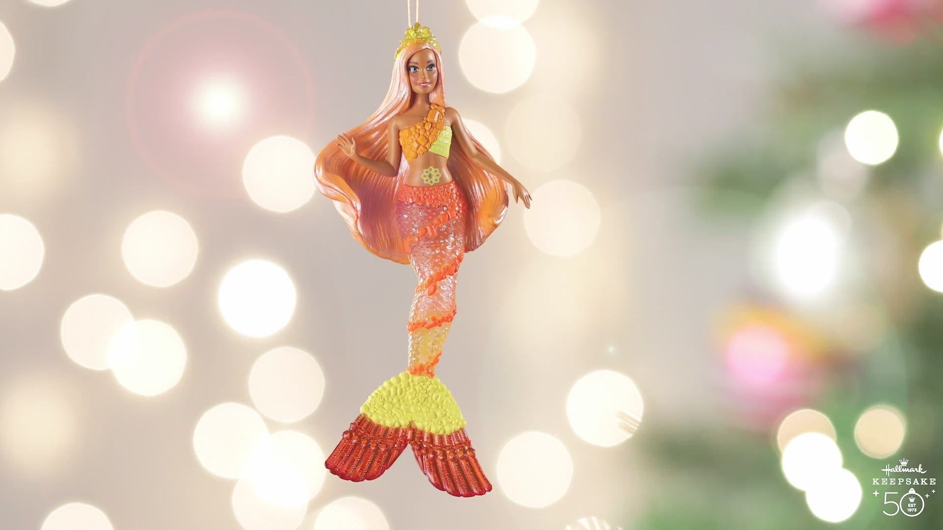Add a real splash of sparkling color to your holiday decor with this Mermaid Barbie Christmas tree ornament. From her flowing orange hair to her colorful striped fin that lights up (battery-operated), this fanciful design inspired by the Barbie doll will have kids and collectors alike dreaming of a colorful Christmas.