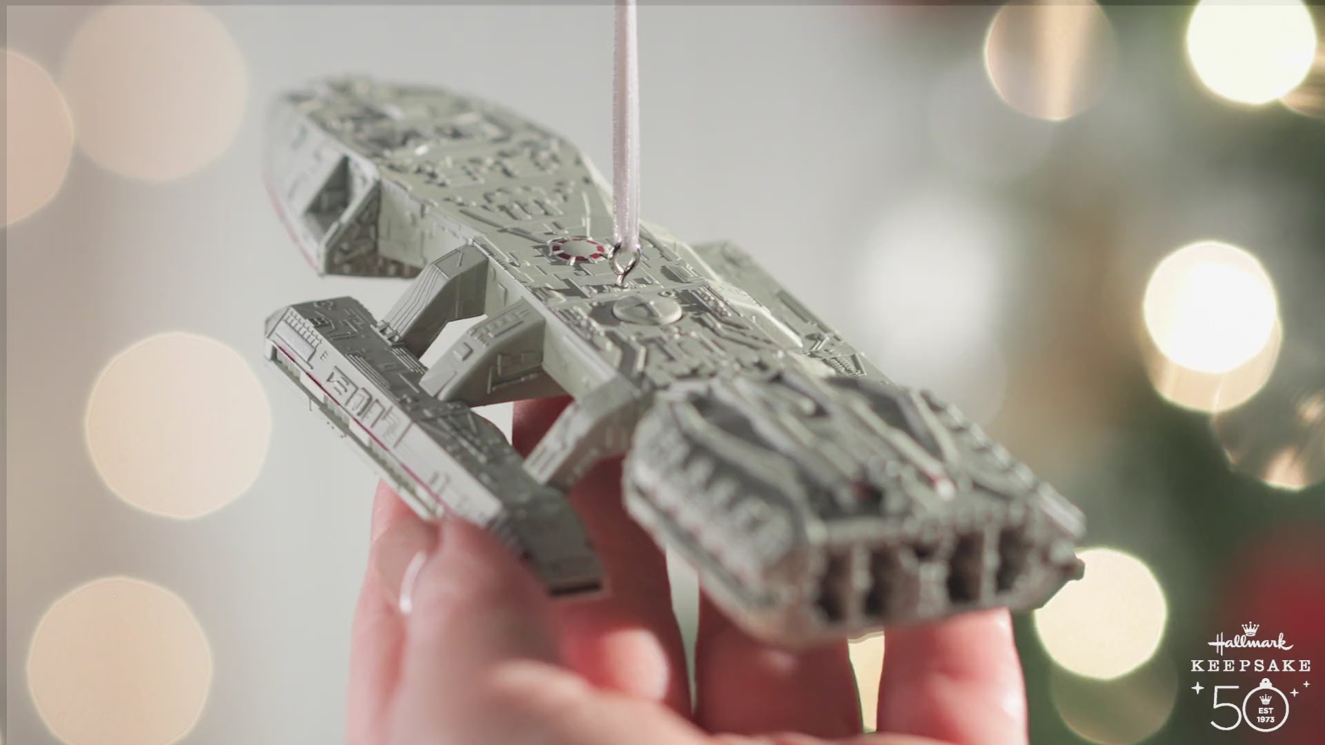 A sizeable battleship and spacecraft carrier, Battlestar Galactica was part of the Twelve Colonies’ defense fleet until a savage attack by the robotic Cylon race virtually destroyed those settlements. Under Commander Adama, Galactica led a ragtag fleet of ships and survivors in search of a new home on a legendary thirteenth colony called Earth. Celebrate their hopeful journey as seen on the beloved 1970s TV series with this Christmas tree ornament that features illuminated accents (battery-operated).