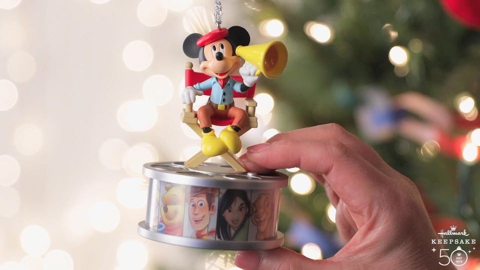 Celebrate 100 years of Disney wonder with this Mickey Mouse Christmas tree ornament. Director Mickey speaks while the film strip below lights up to highlight beloved Disney and Disney/Pixar animated characters (battery-operated): Winnie the Pooh, Woody, Mulan, Simba, Tiana, Nemo, Elsa, Miguel, Minnie Mouse, Snow White, Dumbo and Tinker Bell.