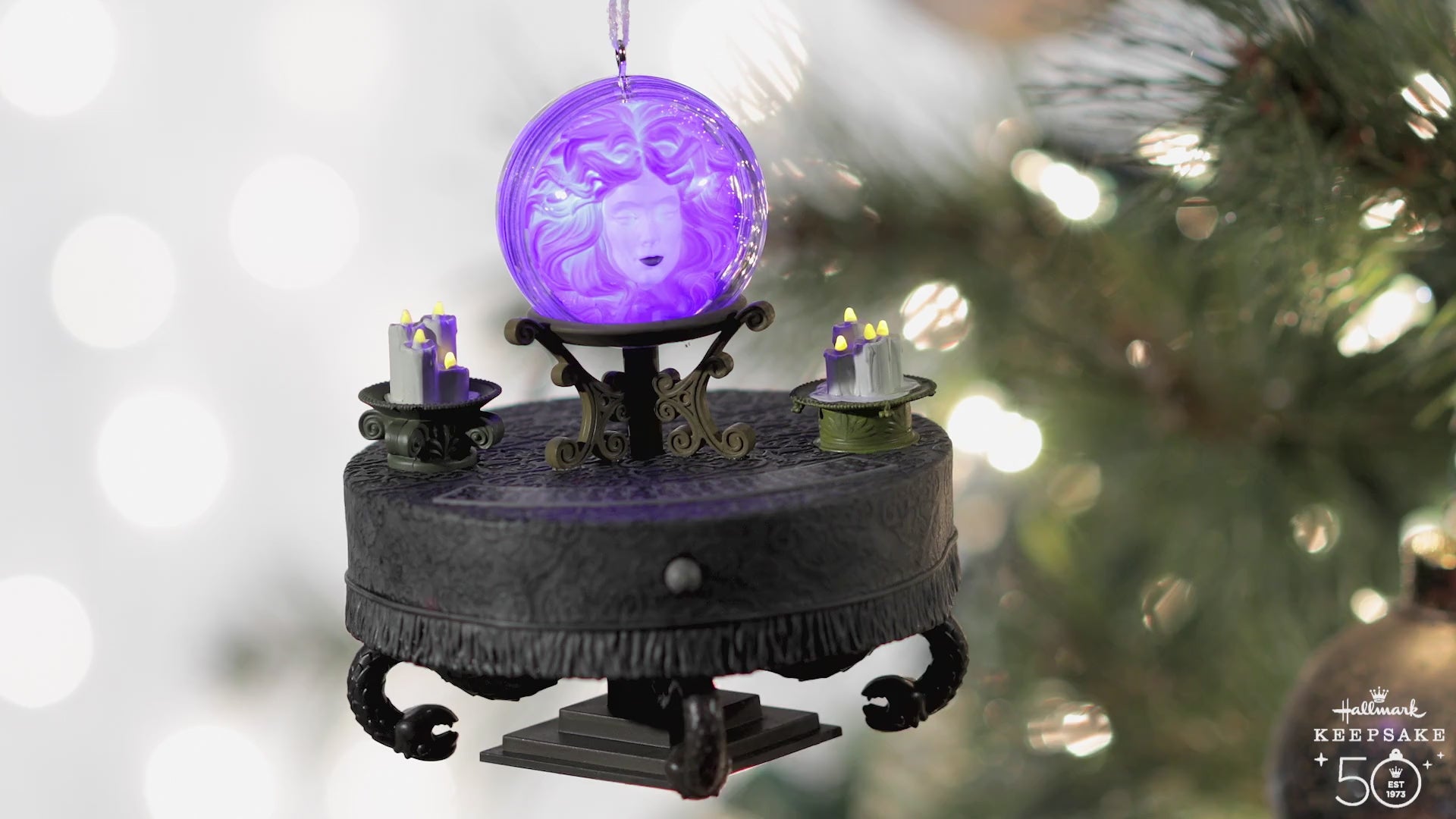 - Key Features: Connect the Interactive Light and Sound ornament to Hallmark's Keepsake Power Cord (sold separately) to see the continuous light effect. Press the button to watch it perform a scene from the Disney Parks attraction, The Haunted Mansion. Add other Disney The Haunted Mansion Collection ornaments to experience even more of the iconic attraction. The coordinating Disney The Haunted Mansion Collection tree topper unlocks narrative content and directs a sequential performance.