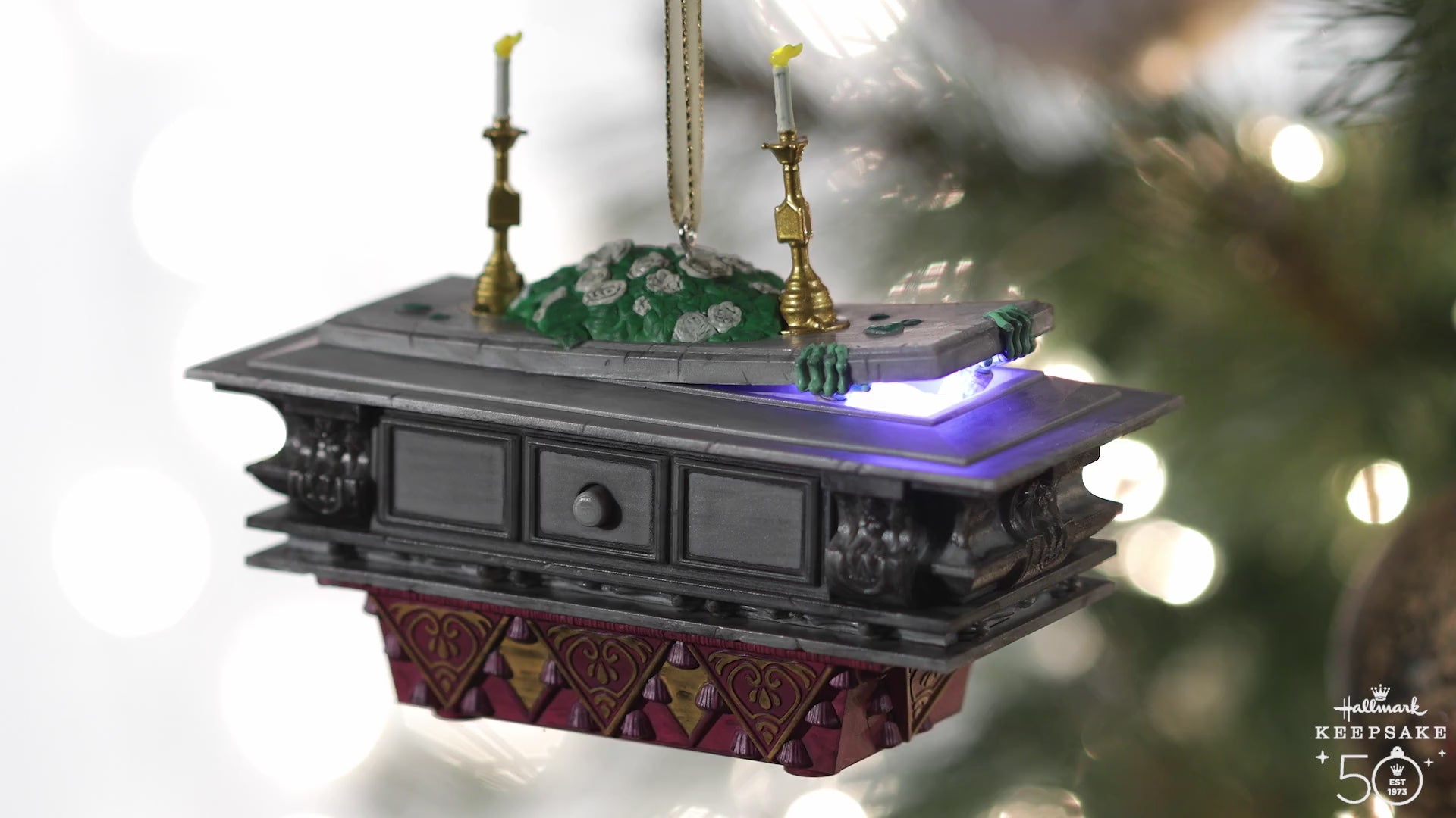 Relive the fun of a visit to the Disney Parks right on your Christmas tree! No tour through The Haunted Mansion is complete without a stop by the Conservatory. This Christmas tree ornament features the iconic skeletal specter in his grandiose coffin, which glows from within. Plug the ornament into Hallmark's Keepsake Power Cord (sold separately) for constant illumination, then press the button to start a sound and light show scene. Connect all of The Haunted Mansion Collection ornaments—Madame Leota, Victor Geist, and The Coffin in the Conservatory—and The Haunted Mansion Tree Topper (each sold separately) to unlock additional amazingly interactive performances. We think you'll agree these happy haunts deserve a place in the dead center of your holiday decor.