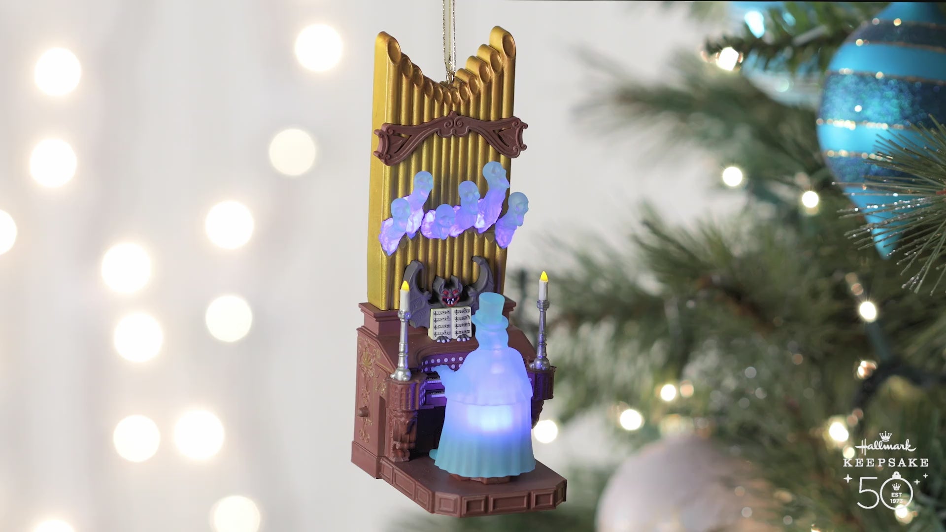 Relive the fun of a visit to the Disney Parks right on your Christmas tree! The resident organist of The Haunted Mansion's Grand Hall, Victor Geist plays "Grim Grinning Ghosts" as a solemn waltz for apparition attendees at a dinner party. This Christmas tree ornament features the spirited musician seated at his pipe organ, which boasts a splendor of specters. Plug the ornament into Hallmark's Keepsake Power Cord (sold separately) for constant illumination, then press the button to start a sound and light show scene. Connect all of The Haunted Mansion Collection ornaments—Madame Leota, Victor Geist, and The Coffin in the Conservatory—and The Haunted Mansion Tree Topper (each sold separately) to unlock additional amazingly interactive performances. We think you'll agree these happy haunts deserve a place in the dead center of your holiday decor.