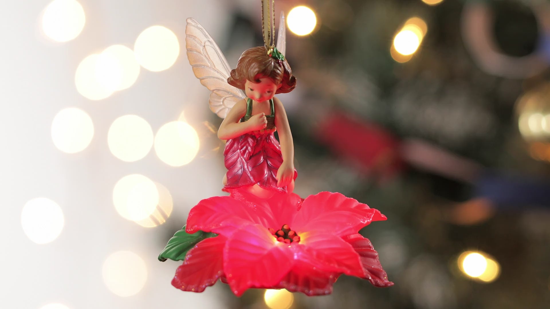 Brighten the holidays when you display this delightful complement to your Fairy Messengers collection. Wearing her pretty pink, petal-inspired skirt with a sprig of holly in her wavy brown hair, the festive Poinsettia Fairy—the first in the beloved Keepsake Ornament series—kneels on the edge of a brilliant red poinsettia blossom. Connect the decoration to Hallmark's Keepsake Power Cord (sold separately) to see it light up.