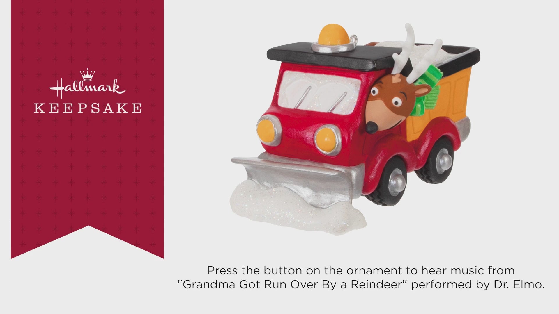 - Key Features: Press the button on the Magic Sound ornament to hear music. Ornament plays music from "Grandma Got Run Over By a Reindeer" performed by Dr. Elmo.