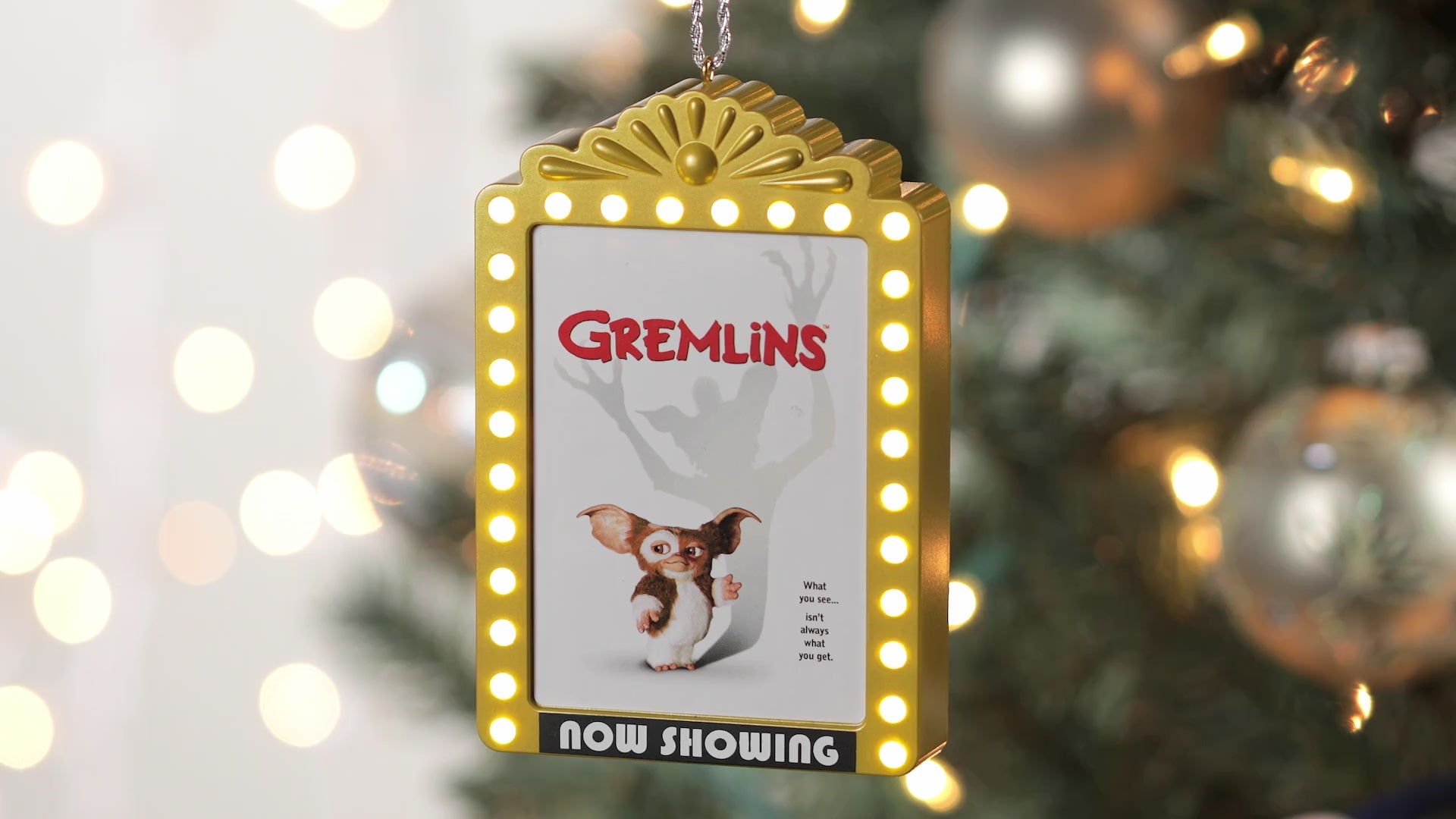 Bring one of your favorite films from 1984 to your tree with this lighted movie marquee Christmas tree ornament. The "Gremlins" one-sheet poster art with Gizmo the cuddly Mogwai (and the shadowy specter of Stripe the Gremlin) is the main attraction in this framed design that features art nouveau flair and a continuous light effect when connected to Hallmark's Keepsake Power Cord (sold separately).