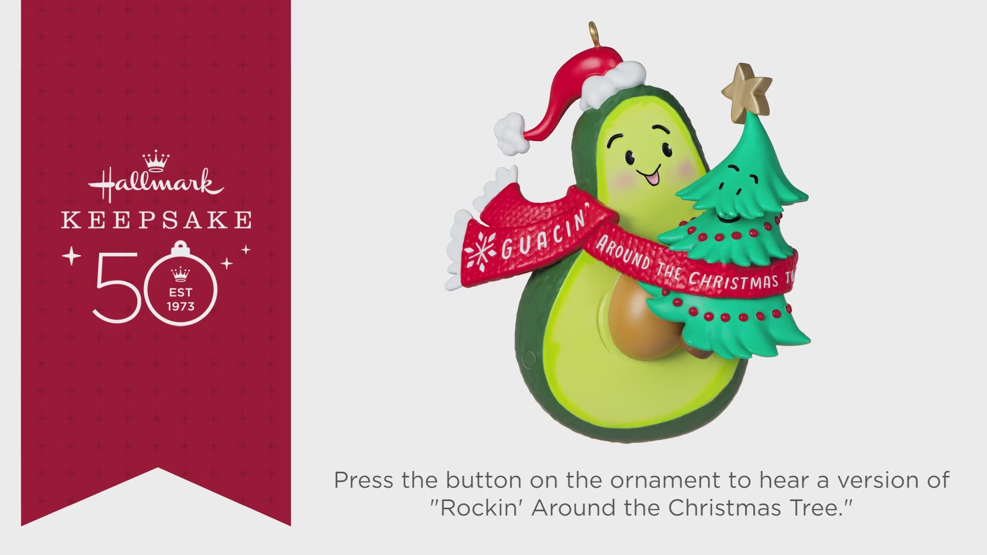 Holiday wordplay is served! Featuring a cute avocado and its cheery Christmas tree dance partner bundled in a scarf, this fun ornament is sure to be the toast of the town—and the tree! Press the button to hear it play an instrumental version of the holiday classic "Rockin' Around the Christmas Tree" (battery-operated).