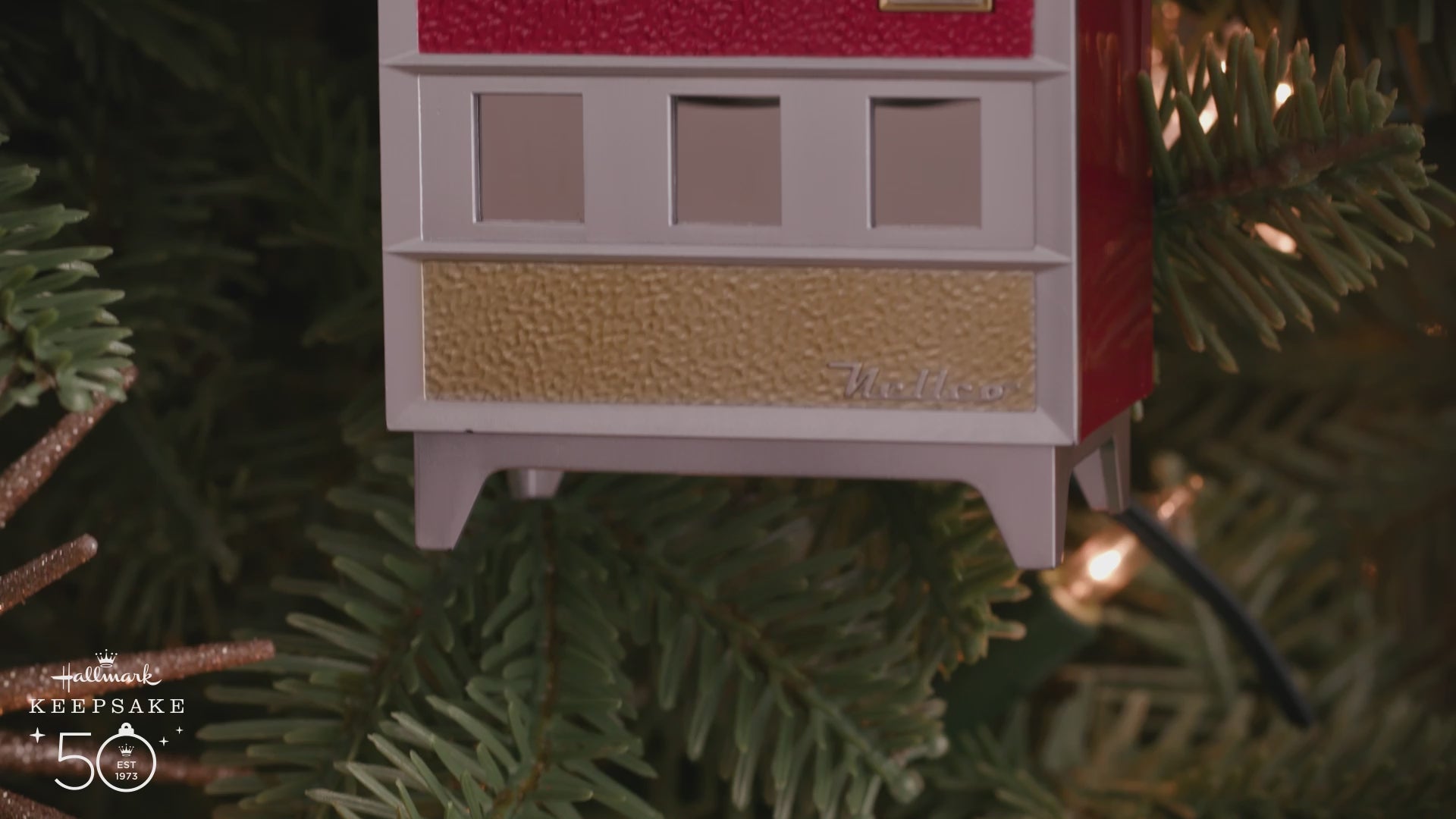 Serve up sweet holiday memories all season long when you display this fun Christmas tree ornament. The festive, retro-inspired eggnog drink machine—a Nellco classic—features a constant light effect when connected to Hallmark's Keepsake Power Cord (sold separately). Press the button to hear a jolly holiday tune as it lights up and "dispenses" one of the eggnog flavors.