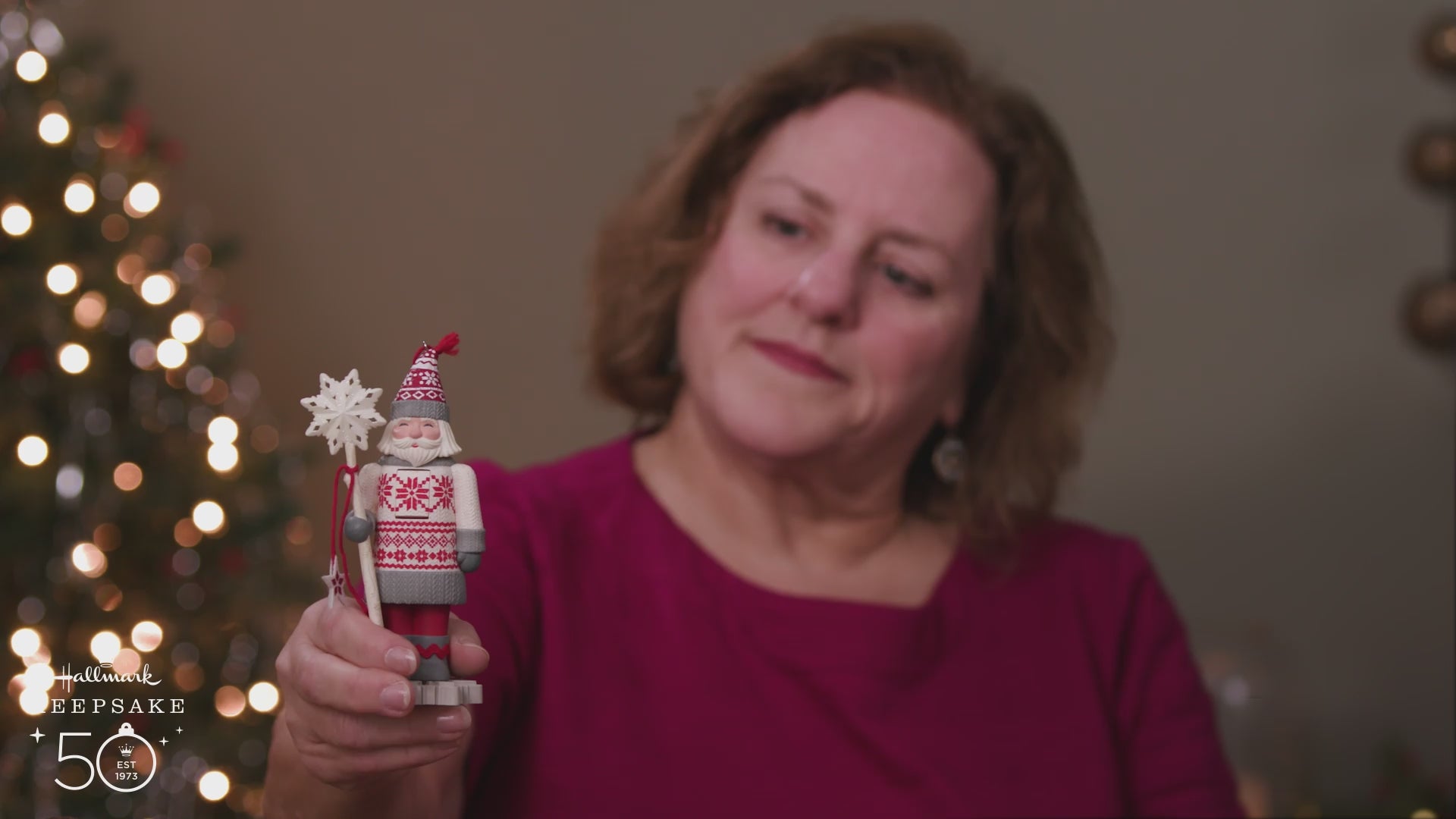 Set the scene for a winter wonderland with this Snowfall Prince Christmas tree ornament. This nutcracker wears a stocking cap and holds a snowflake staff, perfectly complementing his cozy ensemble that features cable-knit detailing and includes a functioning lever on the back.