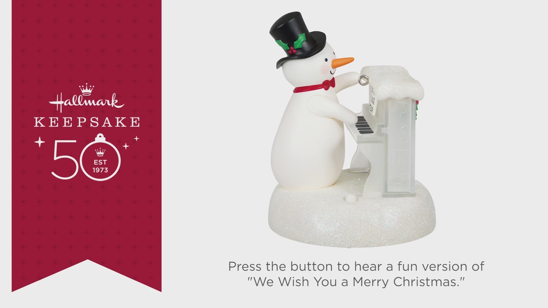 Tis the season for gathering with friends and family to sing Christmas carols! Capture special holiday moments with this Christmas tree ornament featuring a snowman, dressed in a festive top hat and bow tie, playing a piano and singing a lighthearted version of "We Wish You a Merry Christmas" when you press the button (battery-operated). Coordinating Sing-Along Showman snowman stuffed animal sold separately.
