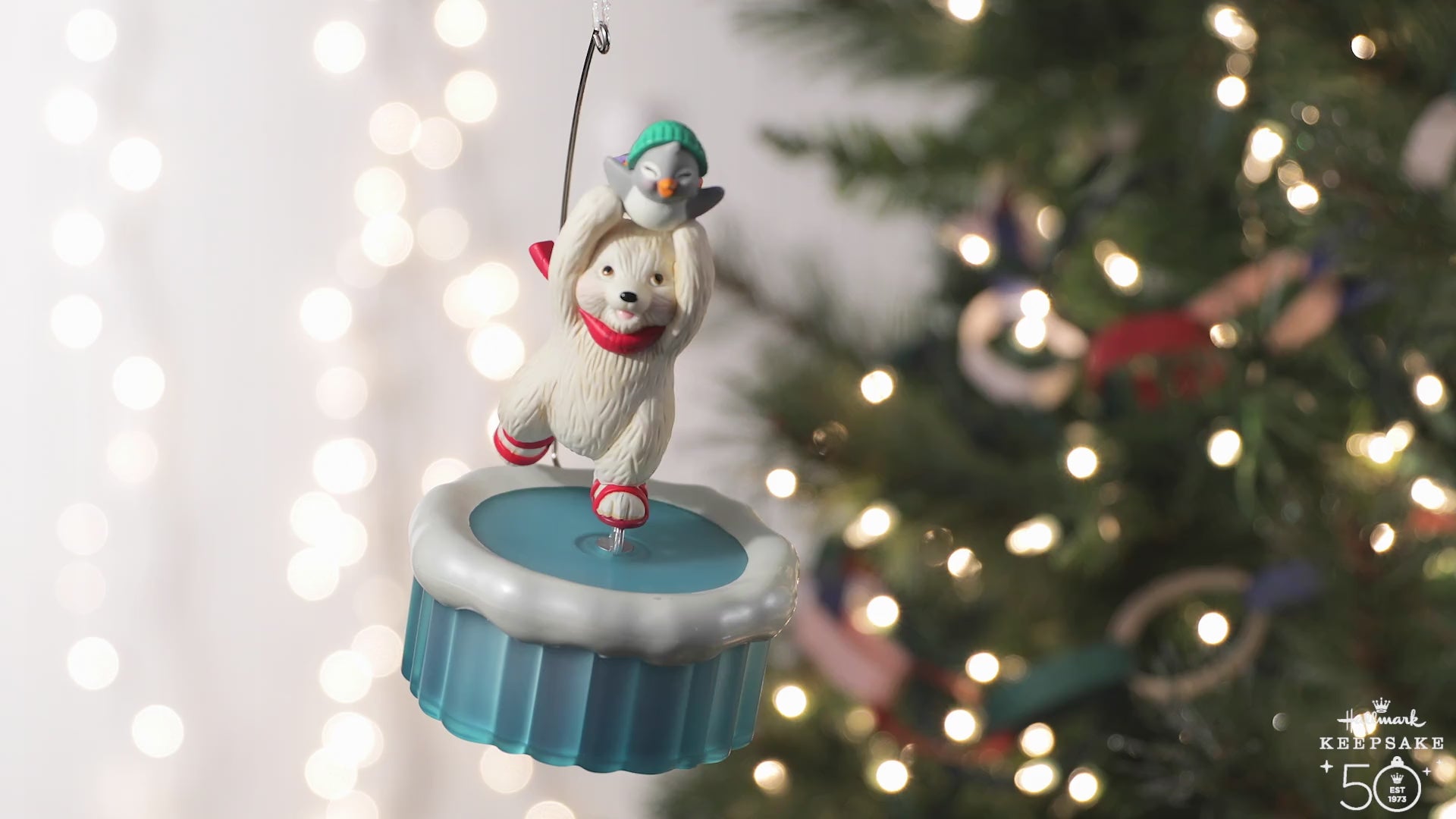 Add some wintertime fun to the holidays with this sweet Christmas tree ornament. Connect the charming decoration to Hallmark's Keepsake Power Cord (sold separately) to watch Snowball the polar bear skate across a shimmery piece of ice with his polar pal Tuxedo the penguin hoisted overhead.