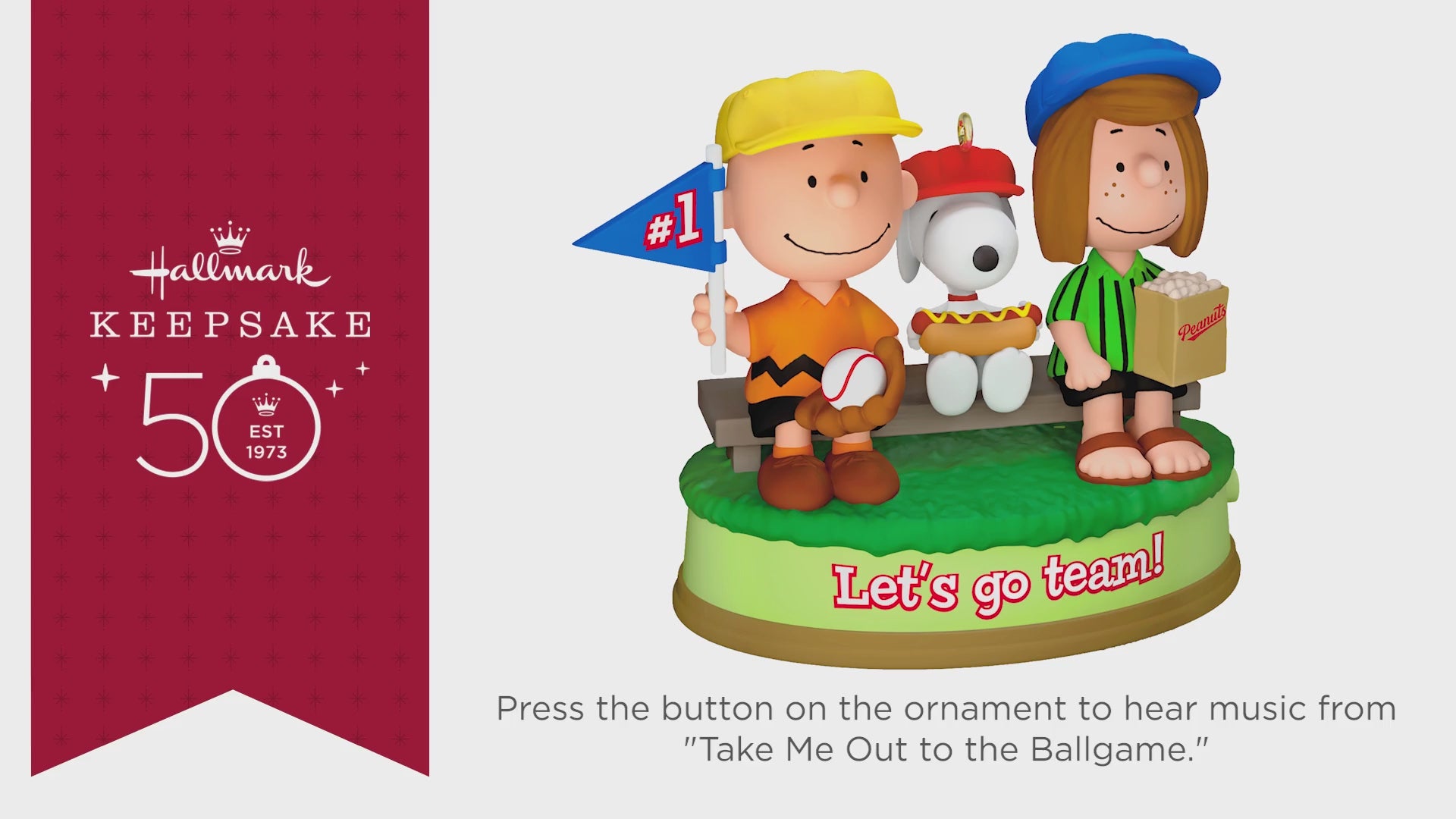 Root, root, root for your home team, and all your Peanuts pals, when you hang this fun Christmas tree ornament. Charlie Brown, Snoopy and Peppermint Patty are geared up with their baseball hats, baseball glove and ballpark treats to cheer on their favorite team. Press the button to hear the decoration play "Take Me Out to the Ball Game."