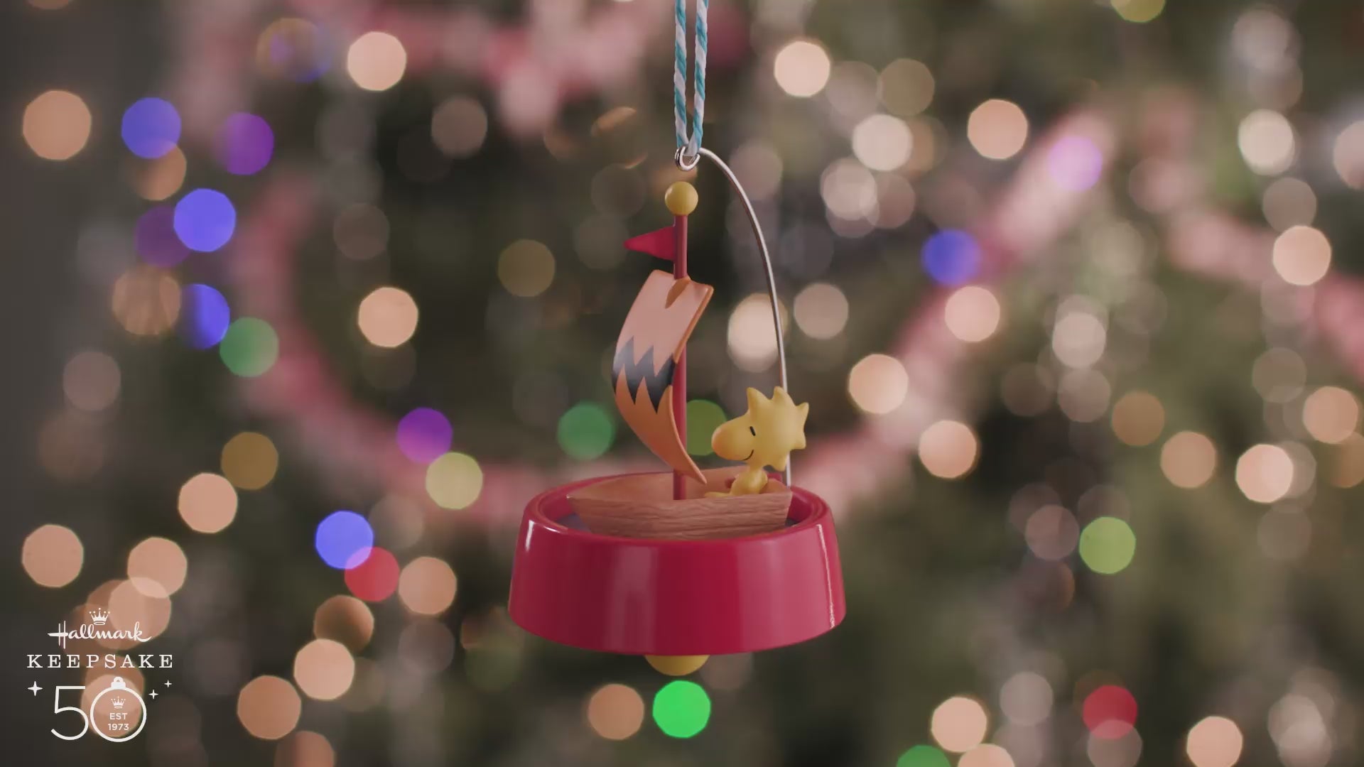 Set sail for the holidays with this adorable Peanuts Christmas tree ornament. Snoopy's pal Woodstock captains a tiny boat with a sail inspired by Charlie Brown's zigzag-stripe shirt in the "wide open sea" of a red dog dish. Turn the knob on the bottom to make the sailboat move.